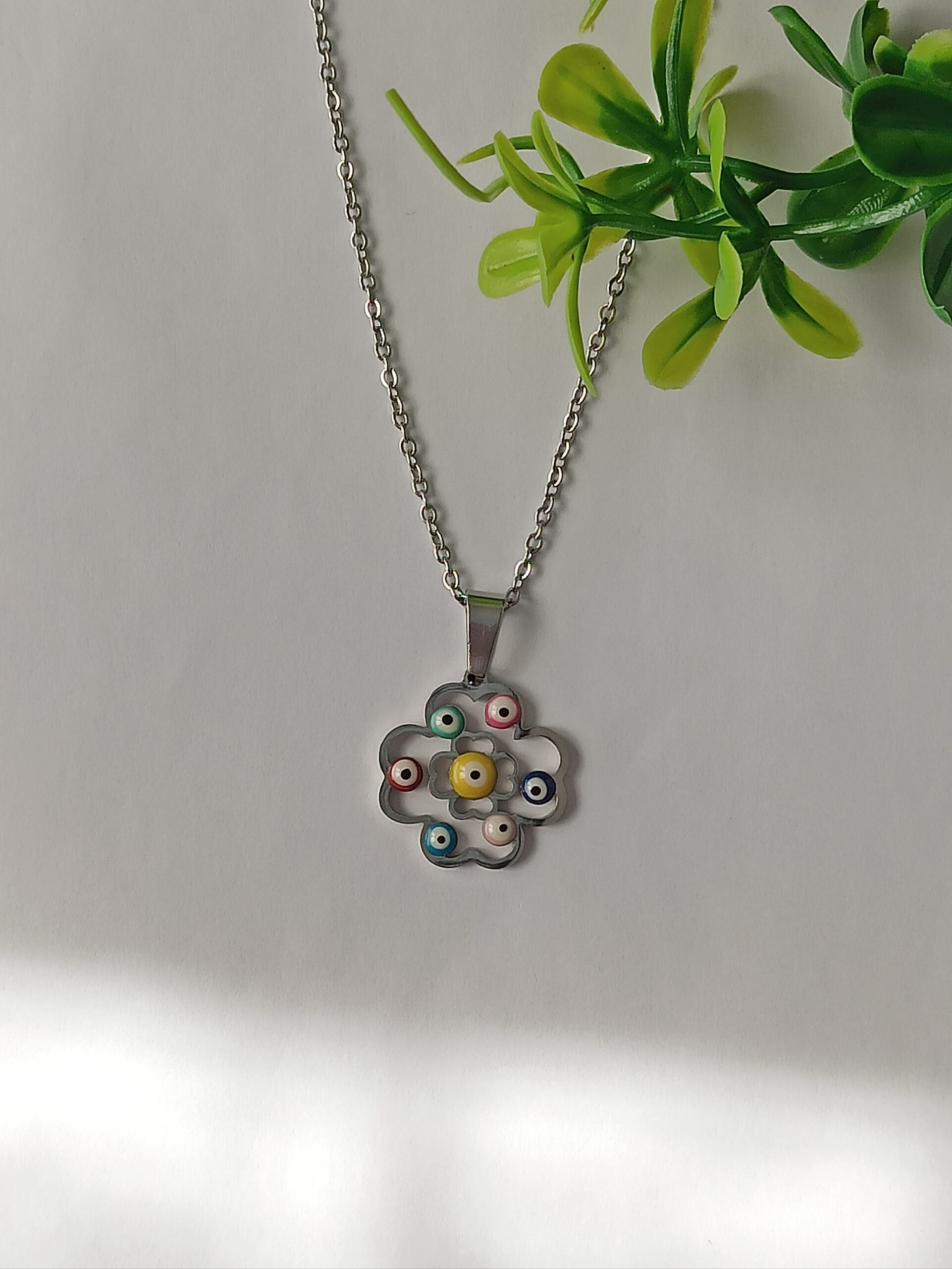 Alrededor del colgante, se pueden observar ojos turcos esmaltados en una variedad de colores vibrantes. Estos elementos decorativos no solo añaden un toque de color y originalidad, sino que también están impregnados de significado cultural, ya que se cree que los ojos turcos ofrecen protección contra el mal de ojo. La combinación de estos ojos con el diseño floral crea un contraste fascinante que capta la atención y despierta el interés.