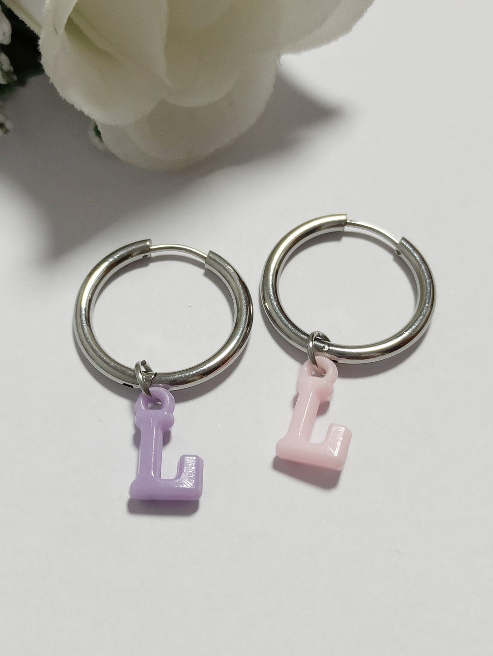 En el centro de estos pendientes se encuentra una inicial, específicamente la letra L, que está confeccionada en acrílico de un color vibrante. Este detalle personaliza la pieza, permitiendo que quien los lleve pueda expresar su identidad o la de un ser querido. La combinación del aro plateado con la inicial de acrílico crea un contraste visual atractivo, haciendo que estos pendientes sean un complemento llamativo y único.