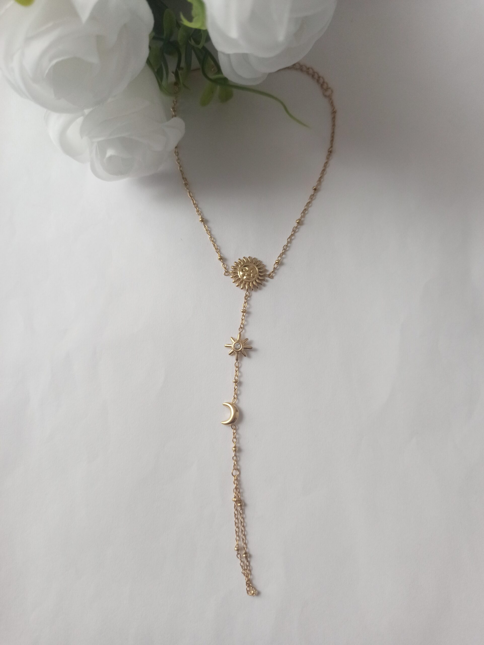 - Tamaño Motivo Longitud: 17cm más 5cm de cadena añadida; largo en dedo con estrella y luna mide 13cm.